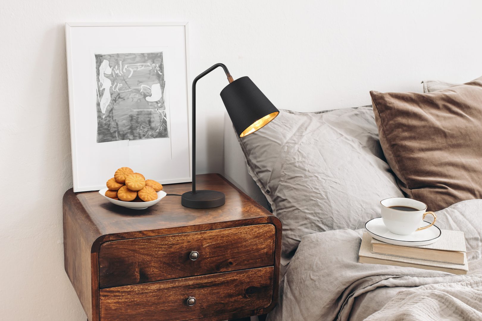 Minimalistliku disainiga laualamp sobib hästi nii elutuppa kui kontorisse ning reguleeritav kangast vari võimaldab suunata valgust vastavalt vajadusele. Matt musta ja kuldse tooniga lamp lisab ruumile stiili ja hubasust.