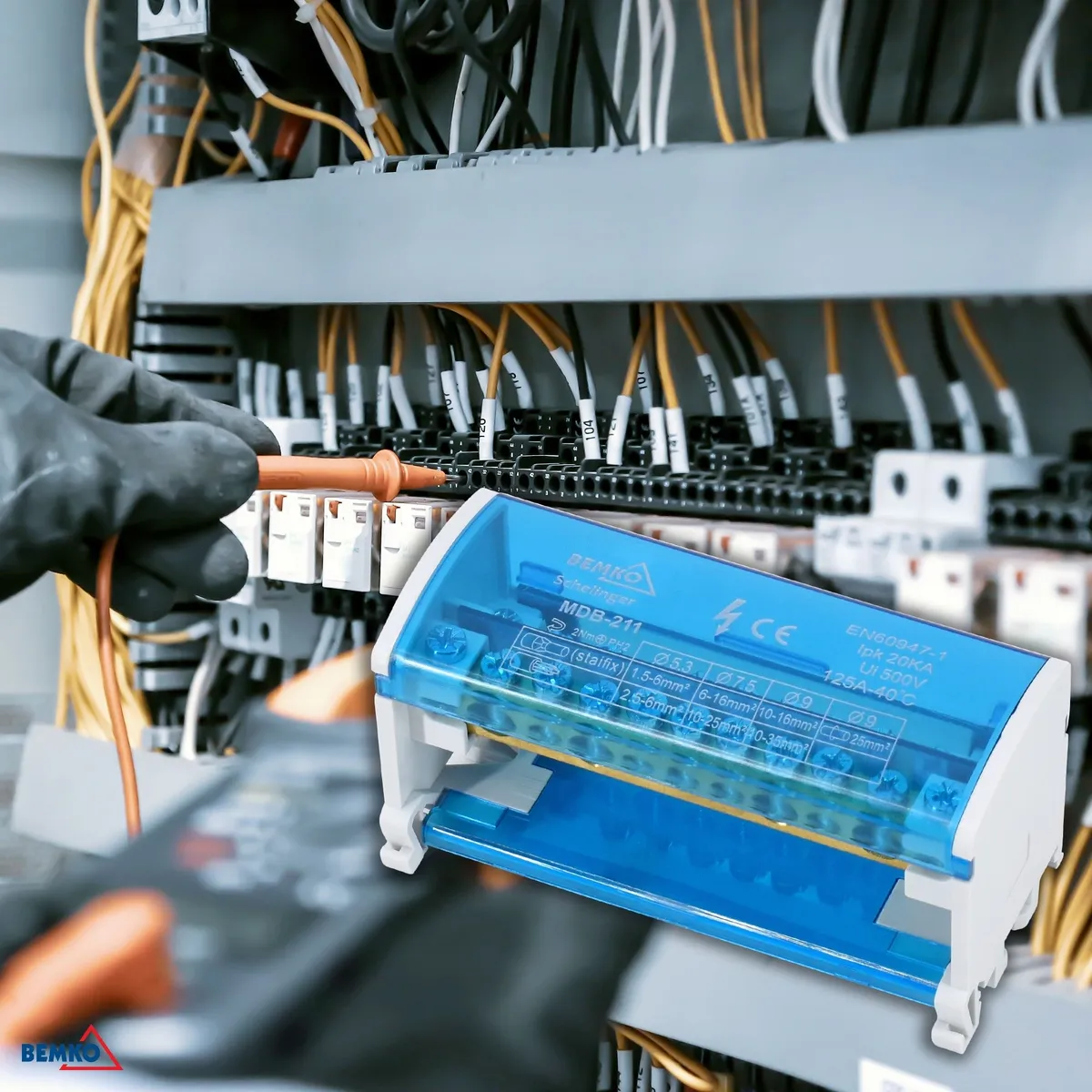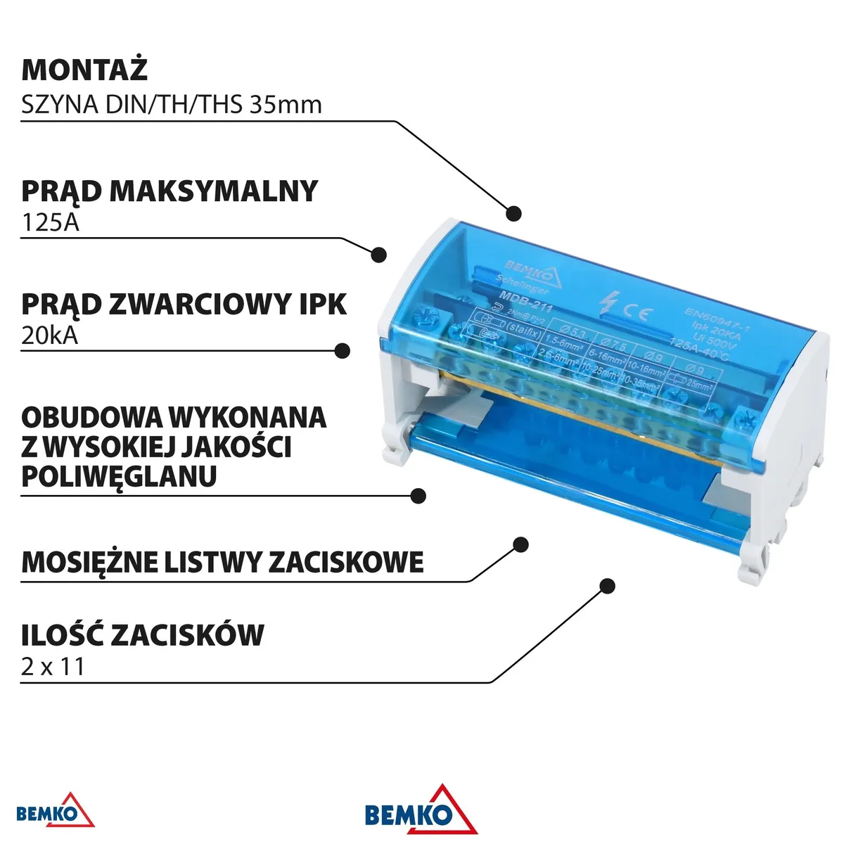 Schelinger jaotusplokk 22 klemmiga (2 x 11), maksimaalse voolutugevusega 125 A ja kaitseastmega IP20.