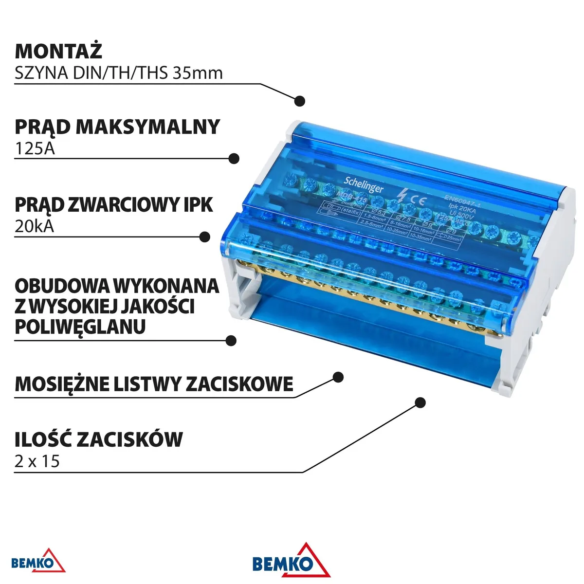 Schelinger jaotusplokk 60 klemmiga (4×15), paigaldamiseks 35mm DIN-liistule (TH/THS).