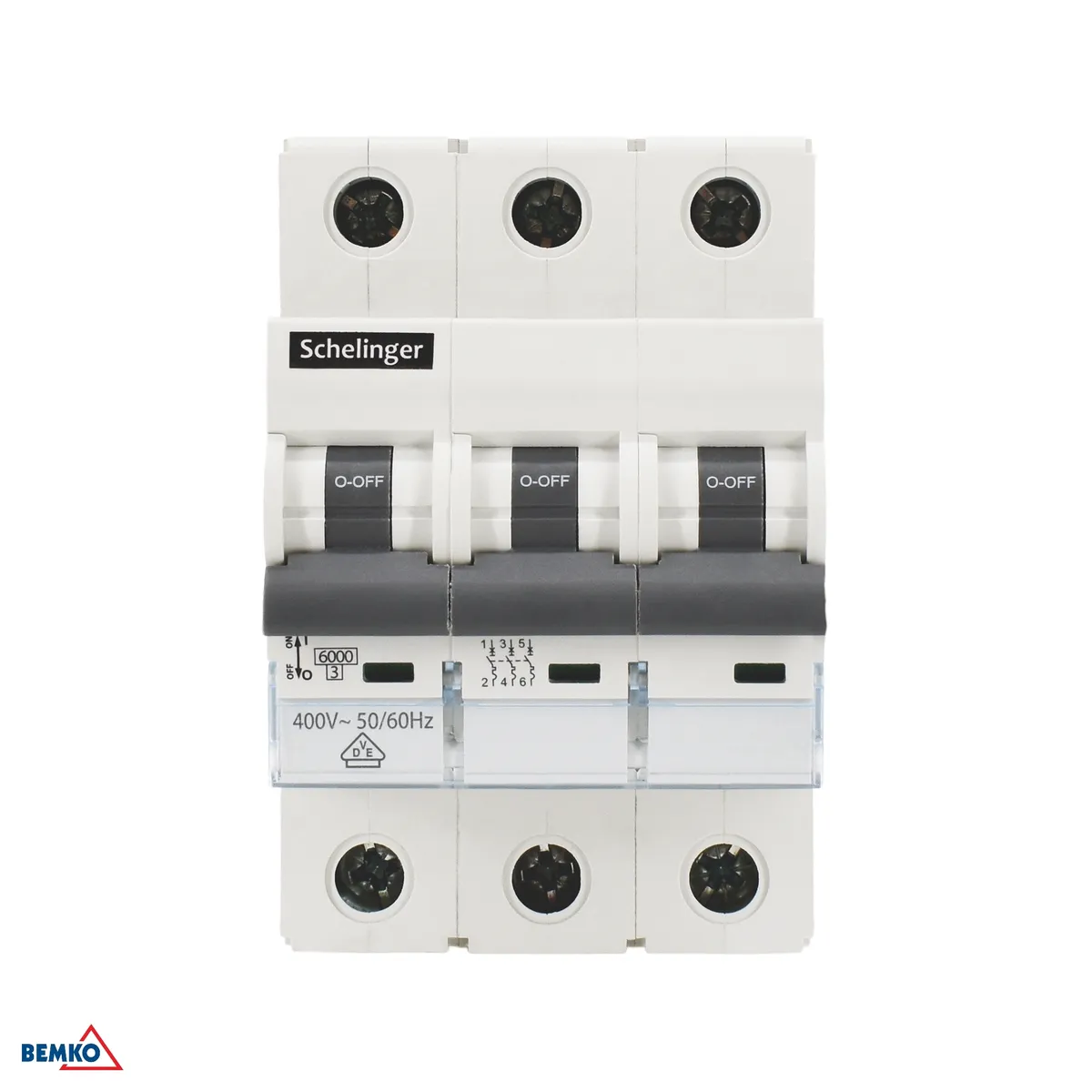 Kolmefaasiline kaitselüliti Schelinger nimivooluga 10A ja B-karakteristikuga, mõeldud 400V 50/60Hz võrku. Lühisvoolu katkestusvõime Icn 6000A (6kA), impulsstaluvuspinge Uimp 4kV, isolatsioonipinge Ui 400V. Kaitseaste IP20, töötemperatuur -5°C kuni +30°C, laius 3 moodulit (53mm).