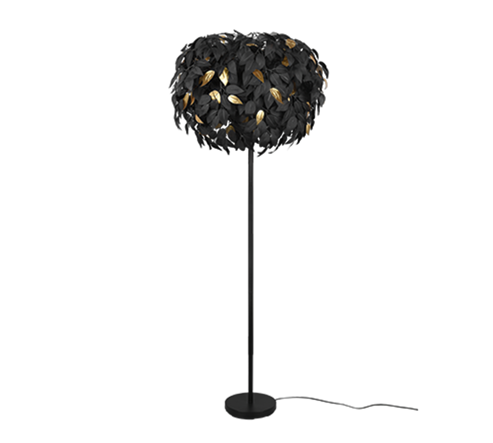 See põrandalamp paistab silma oma mustade ja kuldsete plastiklehtedega, mis loovad hubase ja stiilse valgusmängu eluruumi. Ideaalne valgusti nooruslikku ja kaasaegsesse interjööri.