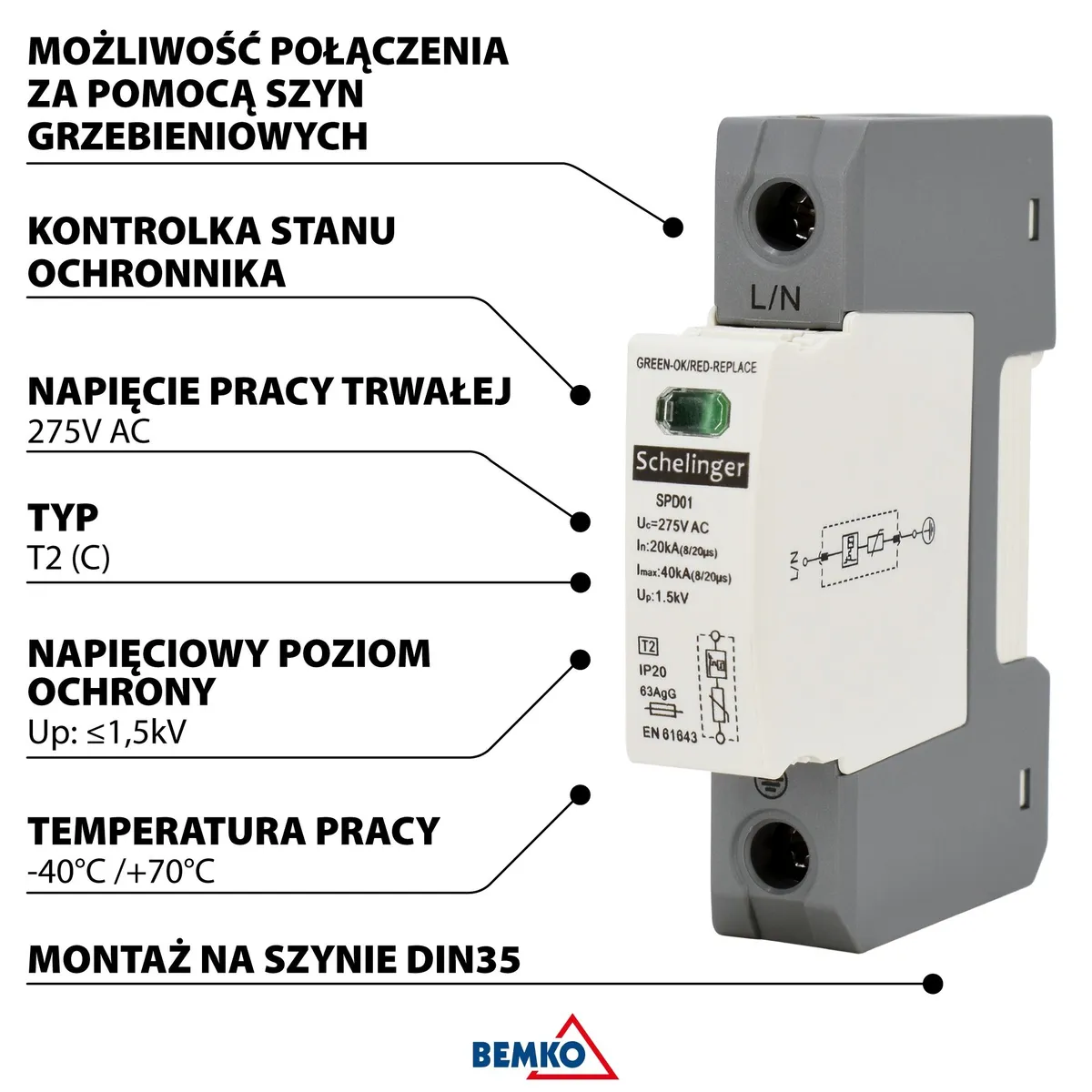 Liigpingepiirik Schelinger 1P klass T2 (C) TH DIN 35 paigaldussiinile. Püsipinge Uc 275V AC, kaitsetase Up alla 1,5kV, maksimaalne tühjenemisvool Imax 40kA (8/20µs). Mõõtmed 90×68×18mm, 1 moodul, kaitseaste IP20, töötemperatuur -40°C kuni +70°C.
