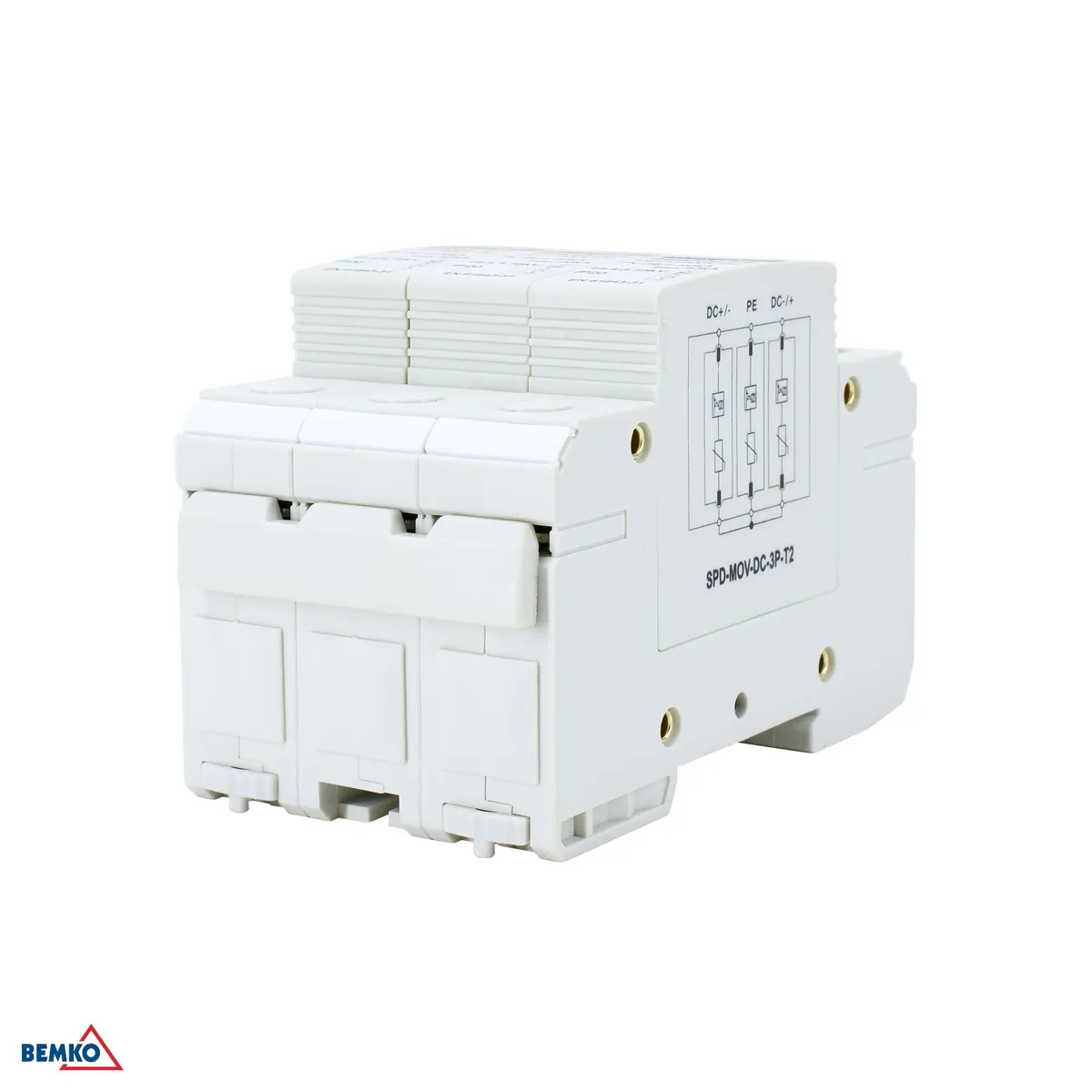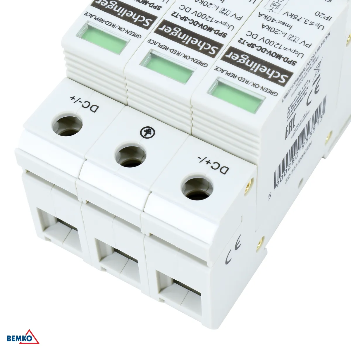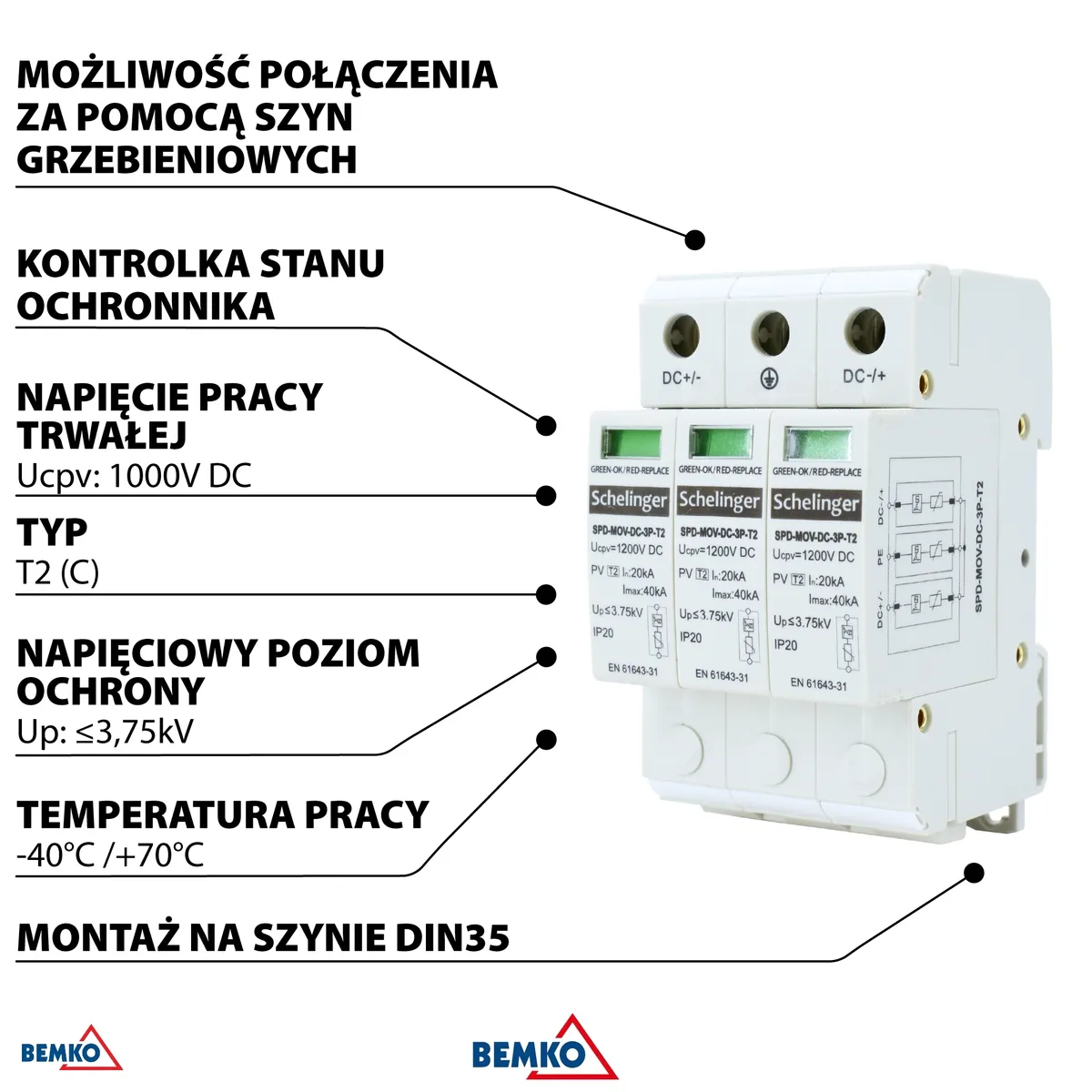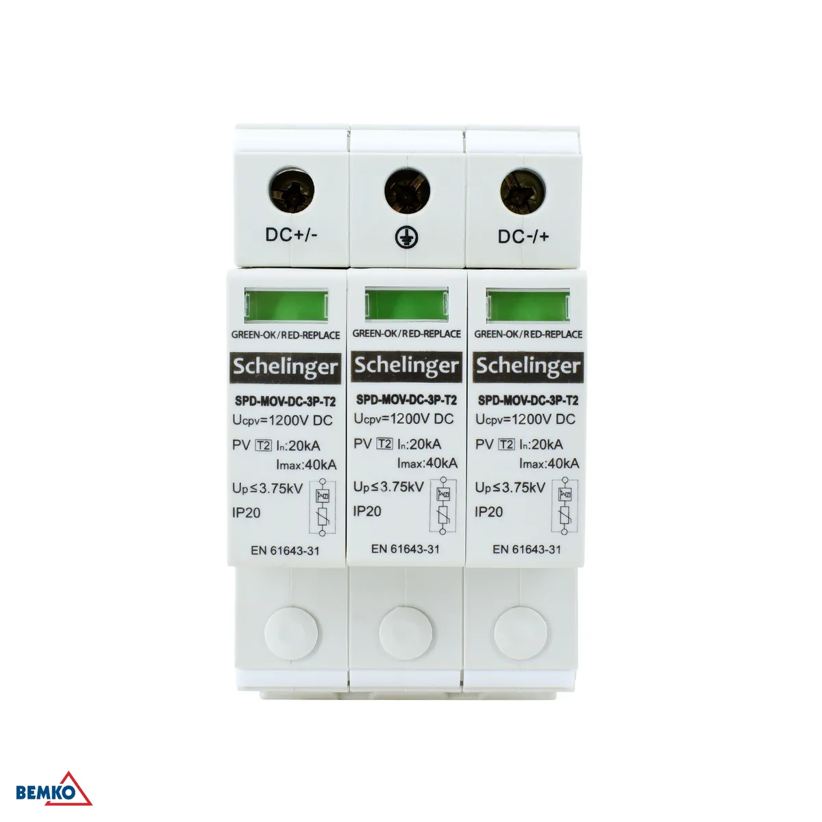Schelinger 3-pooluseline liigpingepiirik DC-süsteemidele pingega kuni 1000V, klass T2 (C). Paigaldatakse DIN-liistule (TH 35), laius 3 moodulit (54mm). Pideva töö pinge Ucpv 1200V DC, kaitsetase Up <3,75kV, maksimaalne tühjendusvool Imax 40kA (8/20μs). Töötemperatuur −40°C kuni 70°C, kaitseaste IP20.