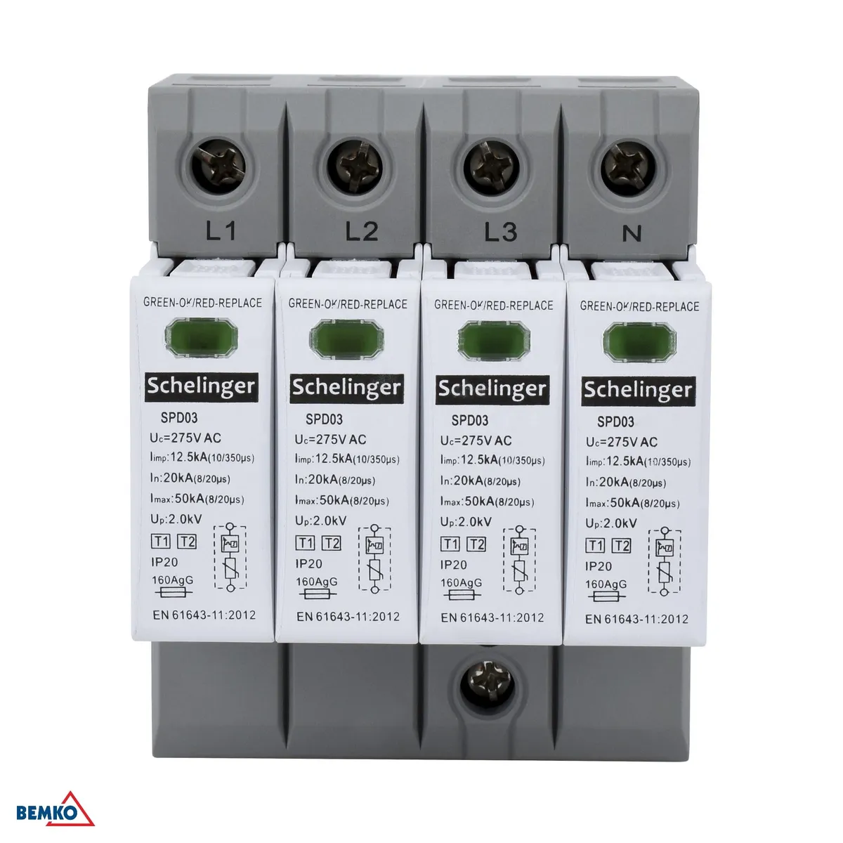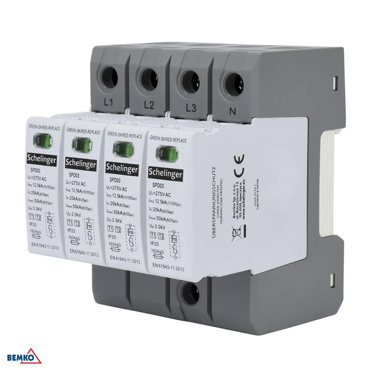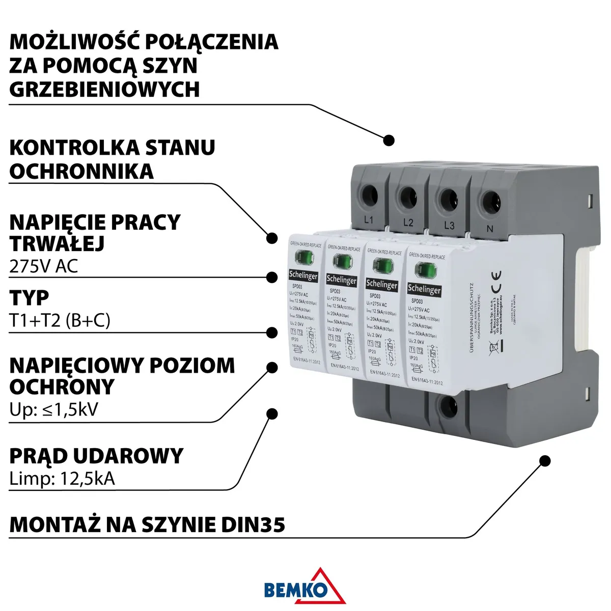 Schelinger 4-polaarne liigpingepiirik klass T1+T2 (B+C) kaitseks elektrisüsteemi välgulöökide ja kommutatsioonipingete eest. Impulssvool Iimp 12,5kA (10/350 μs), maksimaalne tühjenemisvool Imax 50kA (8/20 μs), pingekaitse tase Up <2,0kV ja püsitalitluspinge Uc 275V AC. Paigaldus TH 35 DIN-liistule, 4 moodulit, kaitseaste IP20, töötemperatuur -40°C kuni +70°C. Mõõtmed 90×72×81mm, karbis 36 tk.