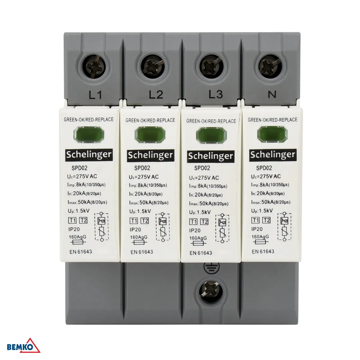 Schelinger 4P liigpingepiirik klass T1+T2 (B+C), paigaldatav TH 35 DIN-latile, 4 moodulit. Impulssvool Iimp 8kA (10/350 µs), maksimaalne tühjendusvool Imax 50kA (8/20 µs), kaitsetase Up <1,5kV, püsitalitluspinge Uc 275V AC. Kaitseaste IP20, töötemperatuur -40°C kuni +70°C. Mõõtmed 90 × 72 × 68 mm.