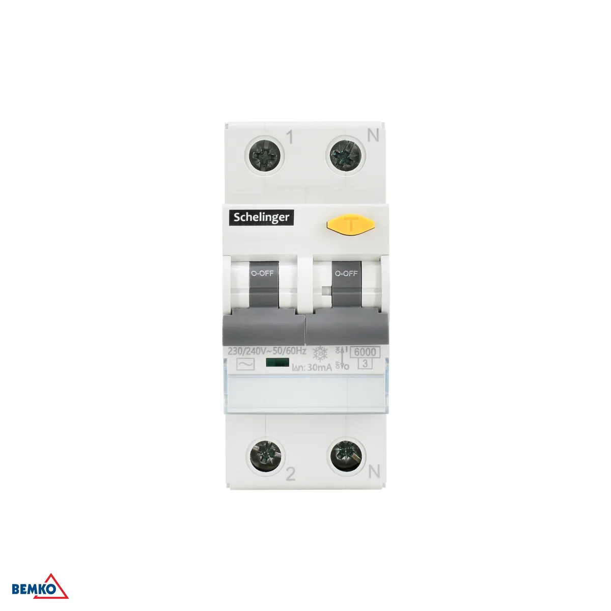 Rikkevoolukaitse-automaat Schelinger RCBO 2P 16A, B-karakteristik, rikkevool 30mA, tüüp AC.