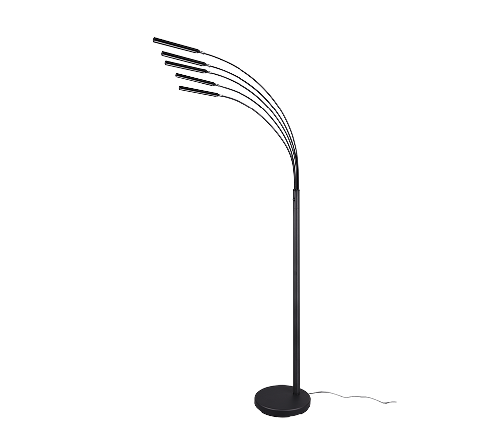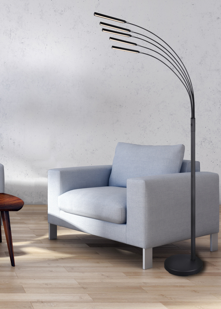 Viie LED-valgustiga põrandalamp loob teie elutuppa hubase meeleolu, võimaldades valida kolme erineva heleduse taseme vahel mugava lüliti abil. Matt must viimistlus lisab modernset stiili ja valgustuse reguleerimine aitab luua just sobiva atmosfääri.