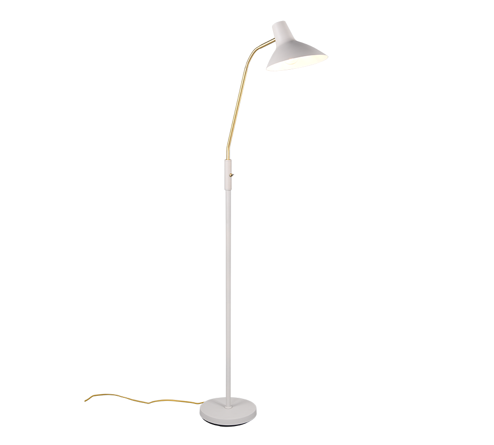 See põrandalamp ühendab elegantsi ja praktilisuse, pakkudes paindlikku valgustust igas kodus. Selle reguleeritav käsi võimaldab suunata valgust täpselt sinna, kus seda kõige rohkem vajate – olgu see siis lugemiseks diivanil või hubase õhkkonna loomiseks elutoas. Soe hall toon koos mati messingviimistlusega lisab ruumile stiili ja luksuslikku tunnet, muutes selle ideaalseks nii kaasaegsesse kui ka klassikalisse interjööri. See lamp toob teie koju mugavust ja funktsionaalsust, muutes iga hetke valgustuse täiuslikuks.