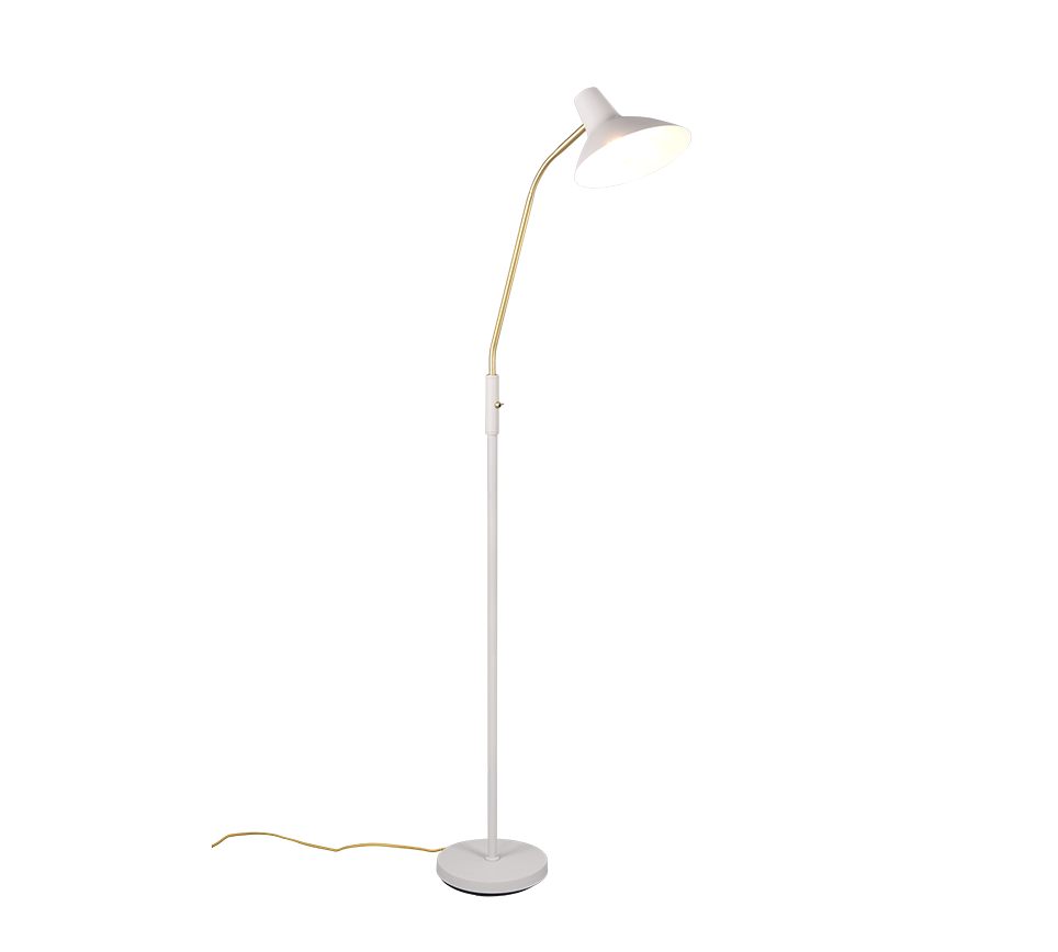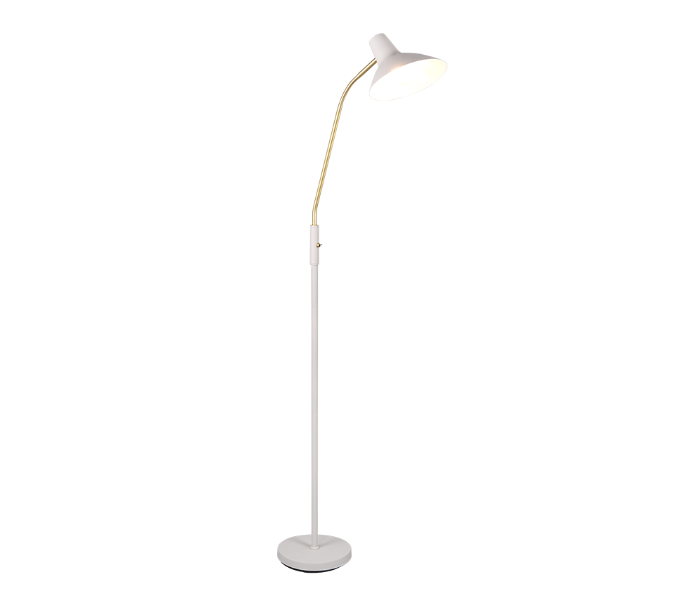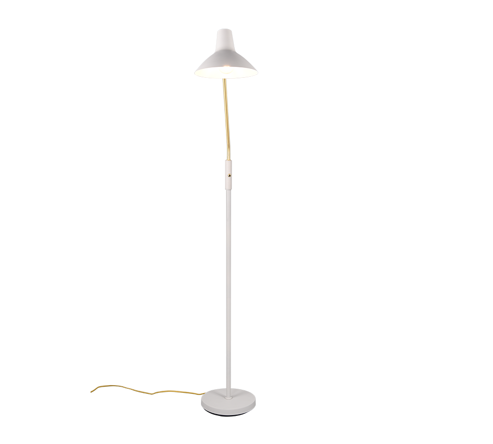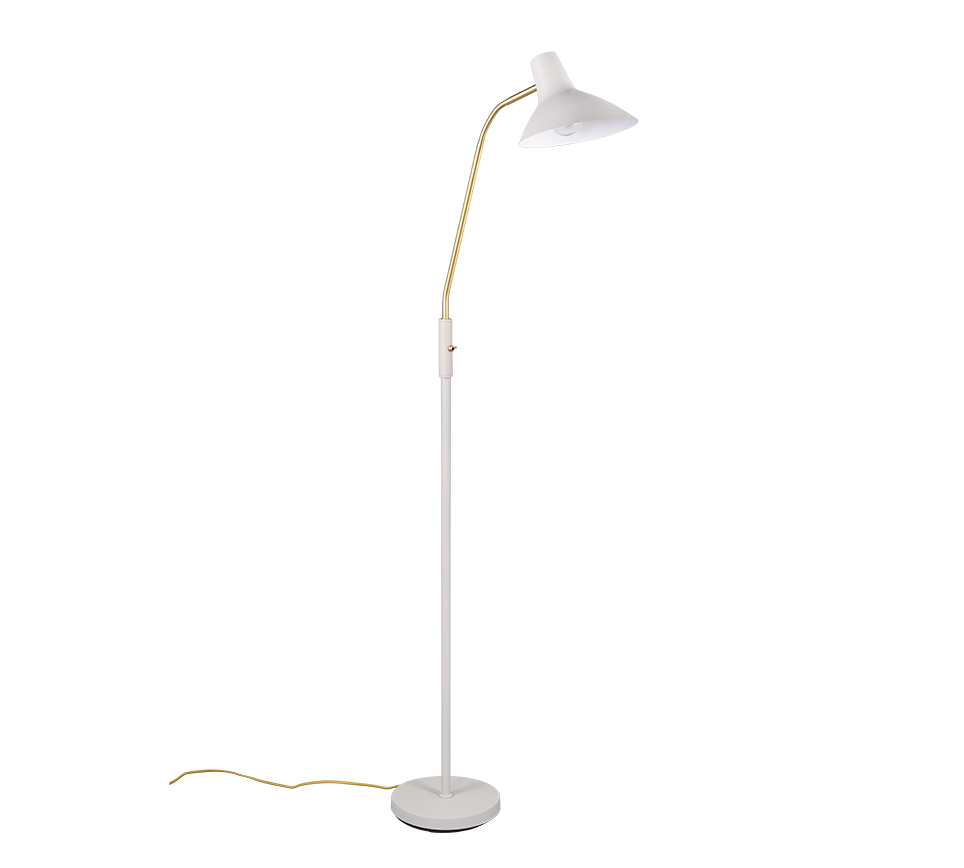 Elegantse disaini ja reguleeritava käega põrandalamp pakub sooja valgust, sobides ideaalselt lugemiseks või meeleolu loomiseks elutoas. Selle matt messingist detailid lisavad ruumile luksuslikku hõngu.