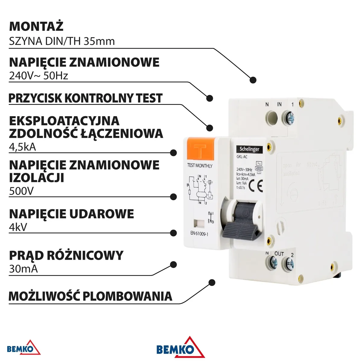 Schelingeri 2-pooluseline rikkevoolu-automaatkaitselüliti nimivooluga 6A ja B-karakteristikuga, rakendumisvooluga 30mA (tüüp AC). Nimipinge 240V~ 50Hz, lühisetaluvus 4,5kA, isolatsioonipinge 500V, impulsspinge 4kV. Paigaldus 35mm DIN-liistule, laius 36mm (2 moodulit), kaitseaste IP20, töötemperatuur -5°C kuni +40°C. Mõõtmed 77×74×36mm.