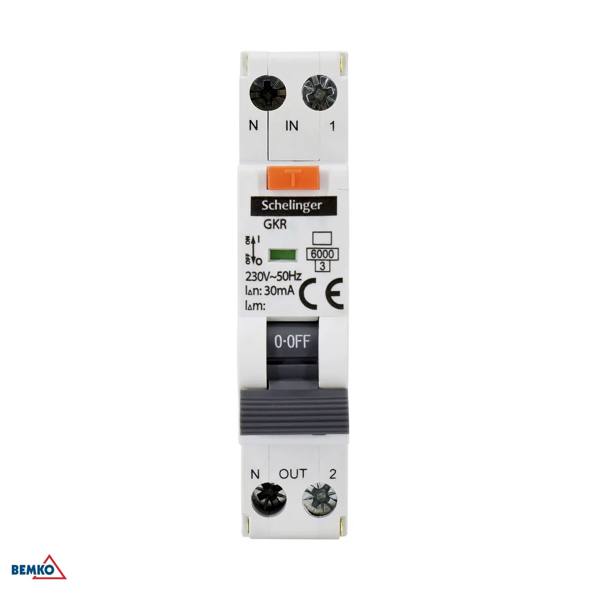 Schelinger rikkevoolukaitselüliti 1P B 16A 30mA tüüp A ühendab liinikaitsme ja rikkevoolukaitsme ühes 1-moodulises korpuses (18 mm). Nimivool 16 A, rakendumisvool 30 mA, karakteristik B, nimipinge ~230 V/50 Hz, lühisekatkestusvõime 6 kA. Paigaldus 35 mm DIN-liistule, kaitseaste IP20, töötemperatuur −25 °C kuni +40 °C. Mõõtmed 81 × 67 × 18 mm.