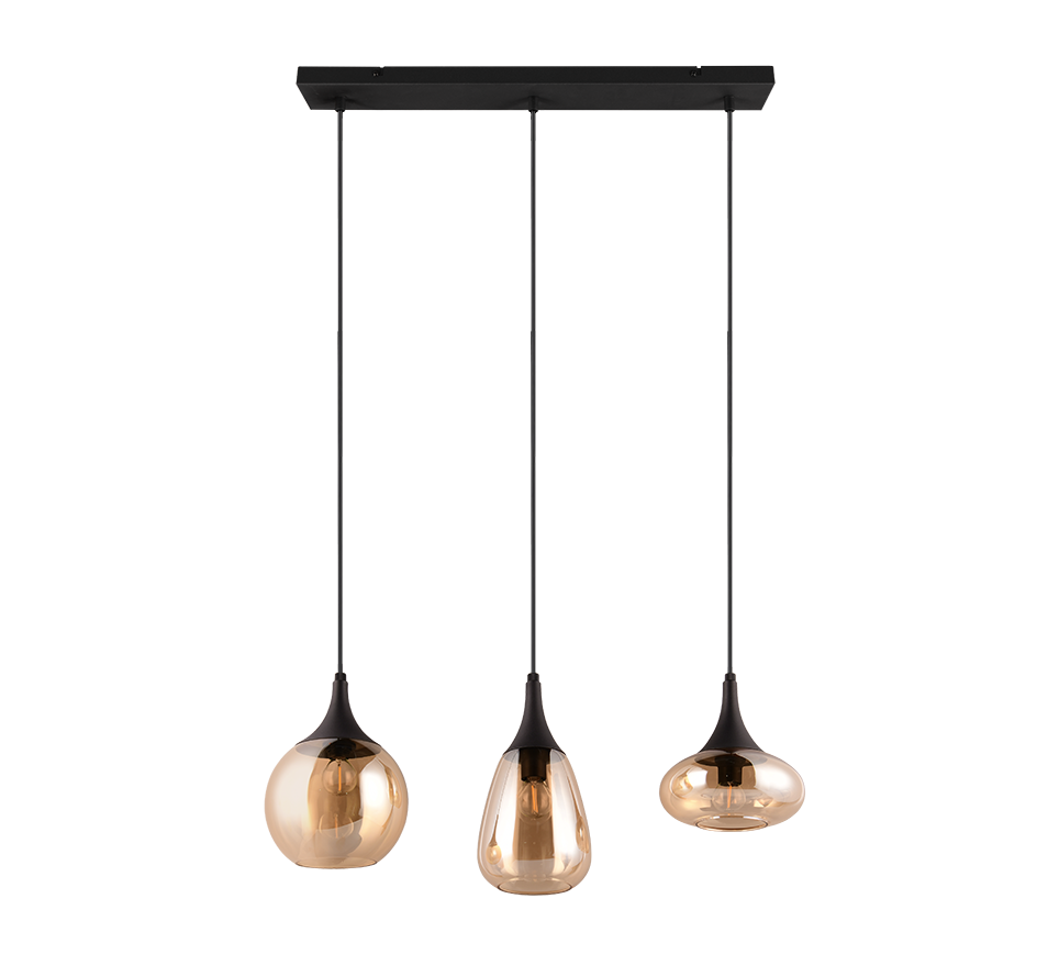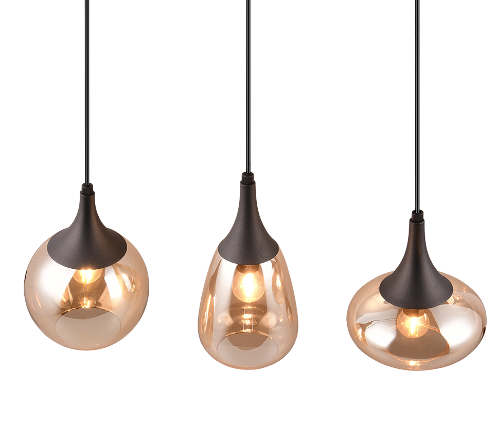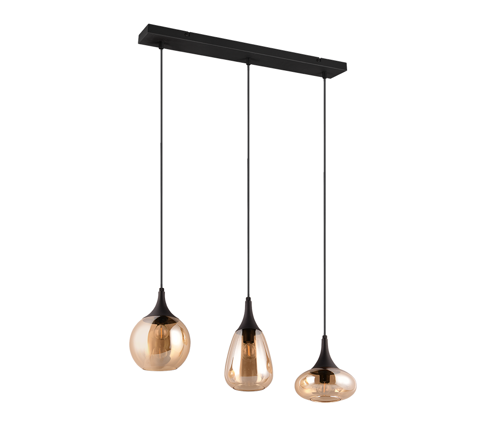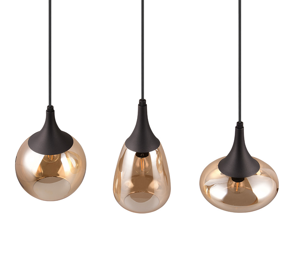 Kolme erineva kujuga matt musta ja merevaigukarva klaasvarjuga rippvalgusti loob teie söögitoas hubase ja stiilse valgusmeeleolu. Metallist ja klaasist detailid annavad ruumile ainulaadse ning elegantse ilme.