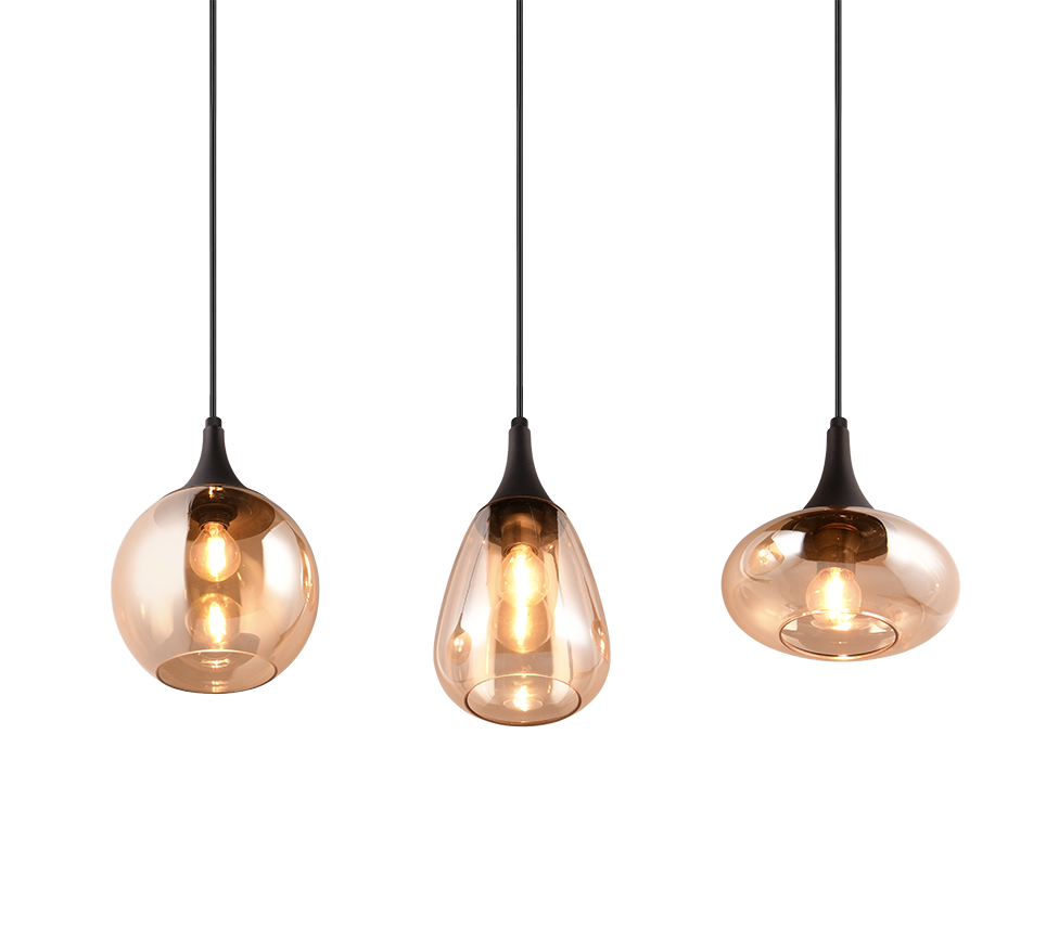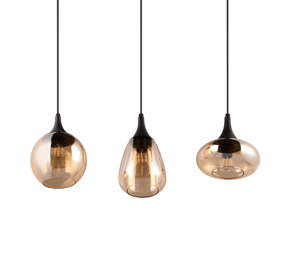 See stiilne riputuskolmik ühendab matt musta metalli ja sooja merevaigukarva klaasi, luues hubase ja kutsuva valguse igasse ruumi. Erinevate klaasivarjude kujud lisavad ruumile isikupära ning sobivad suurepäraselt nii söögitoa kui ka elutoa valgustamiseks, andes õhtutele meeldiva ja elegantse õhkkonna. Tänu E14 pirnidele saab valgusti efektiivselt reguleerida vastavalt meeleolule, muutes selle ideaalseks nii argipäeva õhtuteks kui ka pidulikumateks hetkeks.