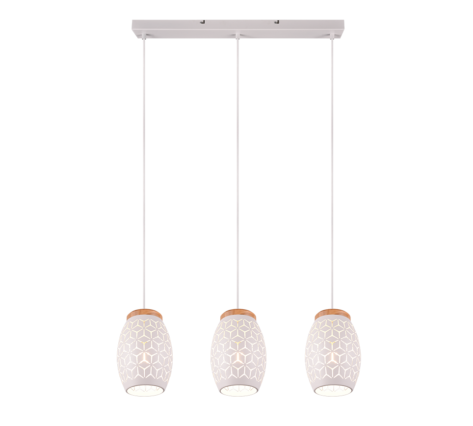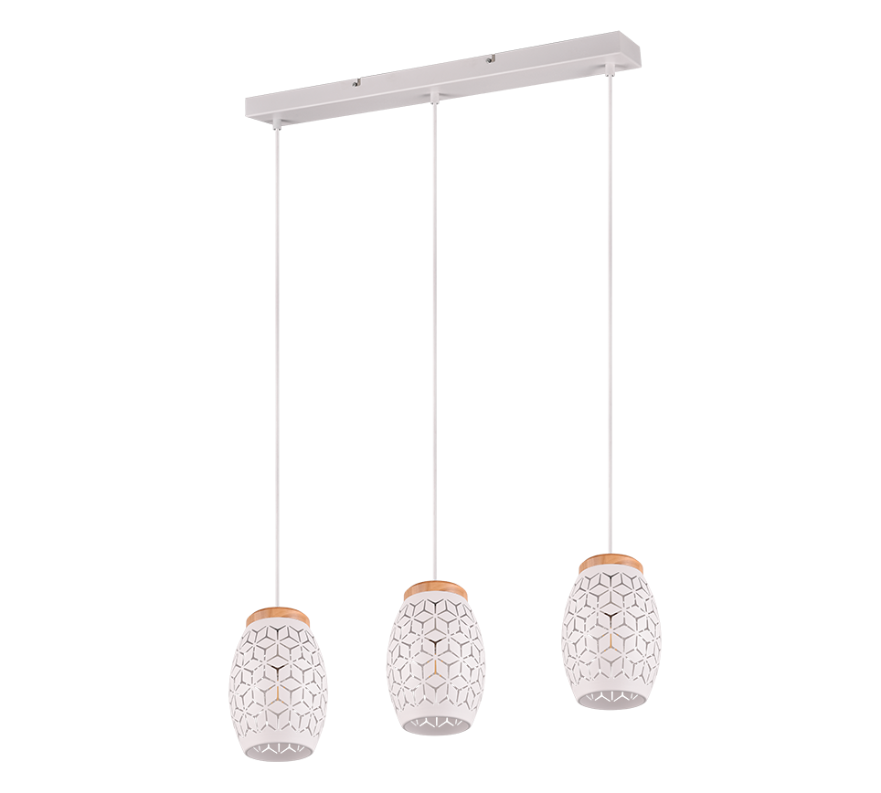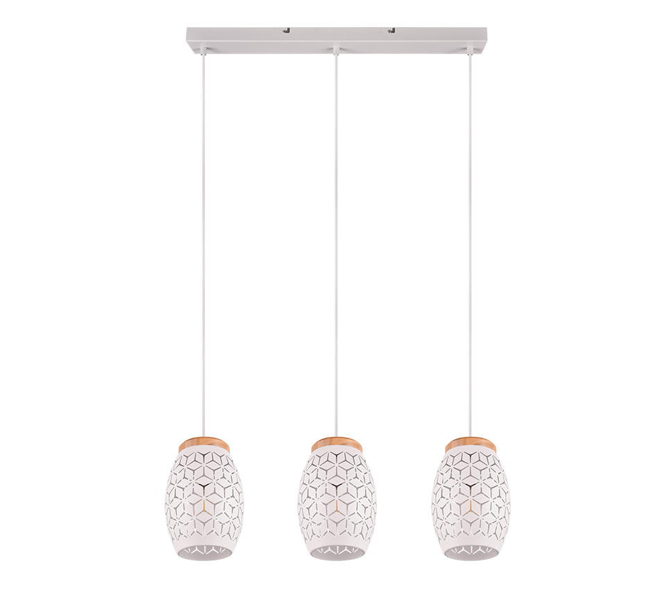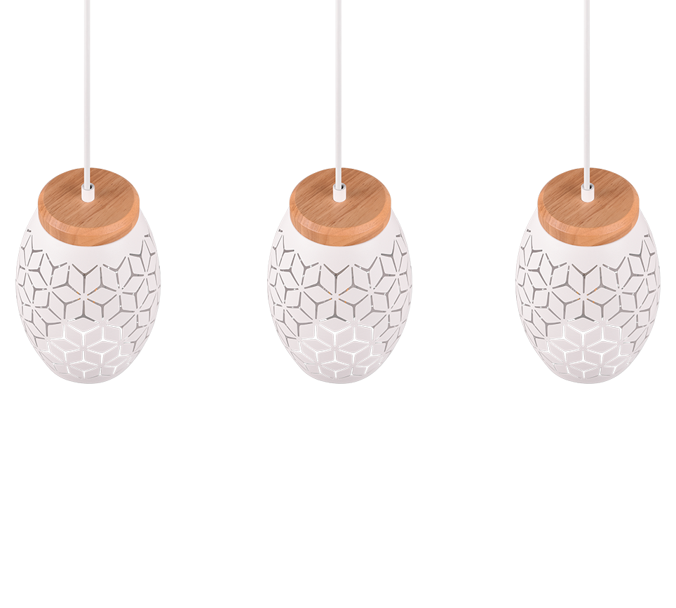 See kolme valguspalliga riputusküünal loob teie kodus sooja ja kutsuva atmosfääri, muutes iga ruumi hubaseks ja stiilseks. Mattvalge viimistlus koos naturaalse puiduga lisab interjöörile naturaalse ja kaasaegse puudutuse, samal ajal kui valgus paistab läbi kaunite mustrite ja loob huvitava valgusefekti ümbruses. Sobib ideaalselt elutuppa, söögituppa või magamistuppa, kus soovite luua meeldiva valgusmängu ja rõhutada ruumi isikupära. Lisaks saab seda kasutada nii LED-valgustitega kui ka traditsiooniliste E27 pirnidega, pakkudes paindlikkust ja energiasäästu.
