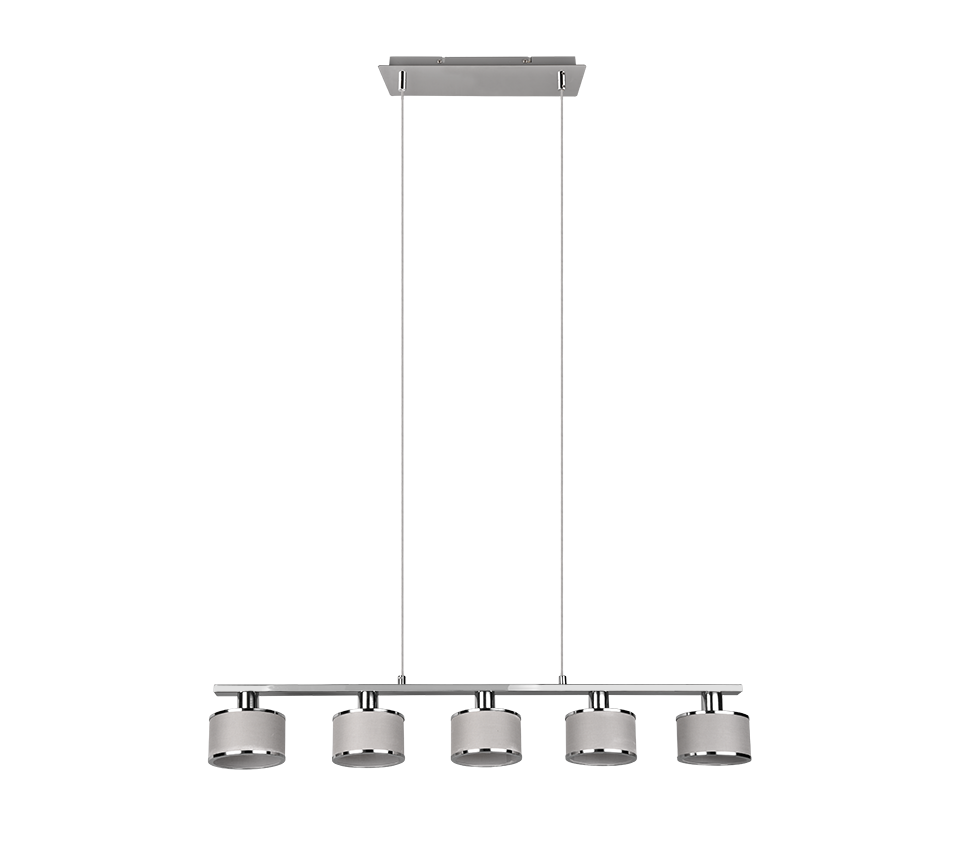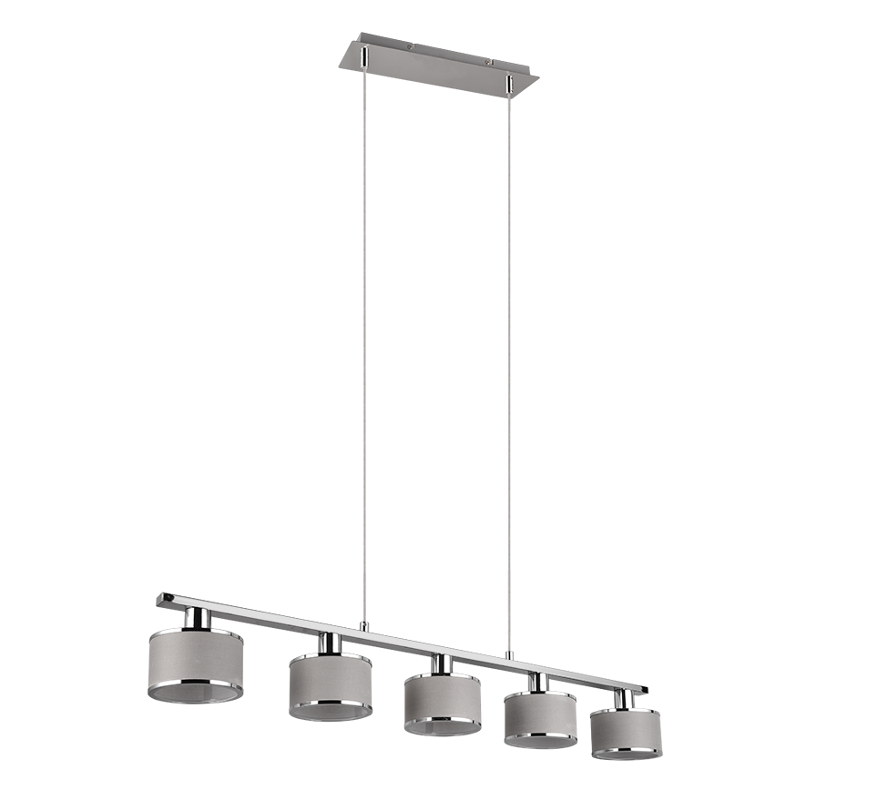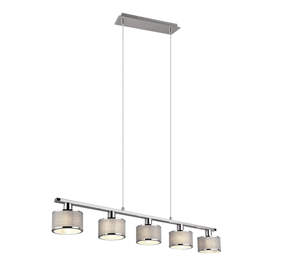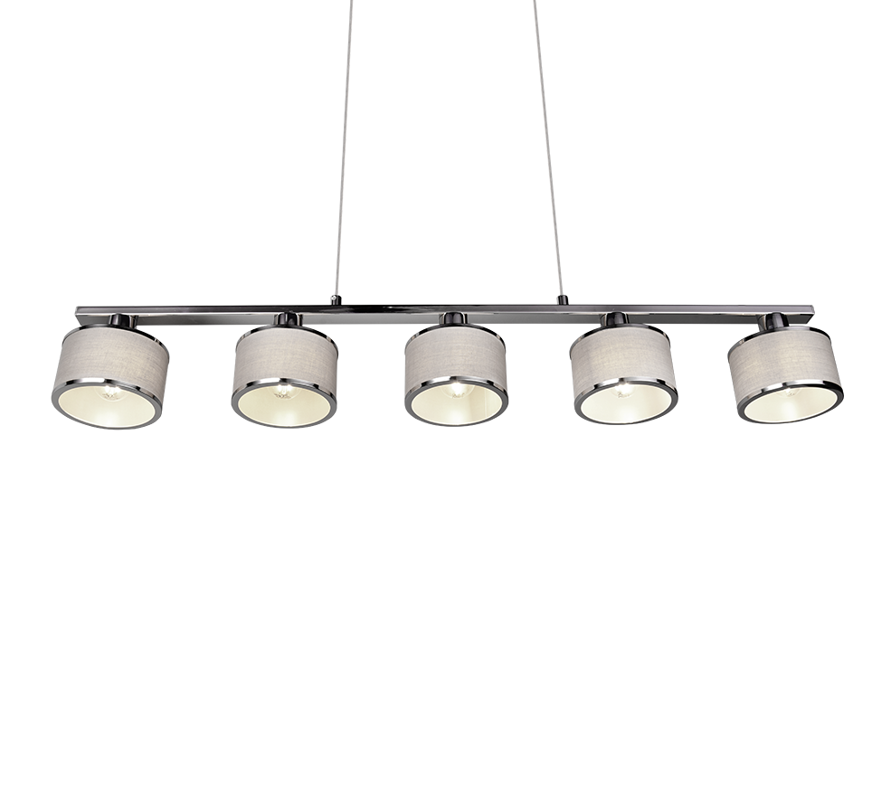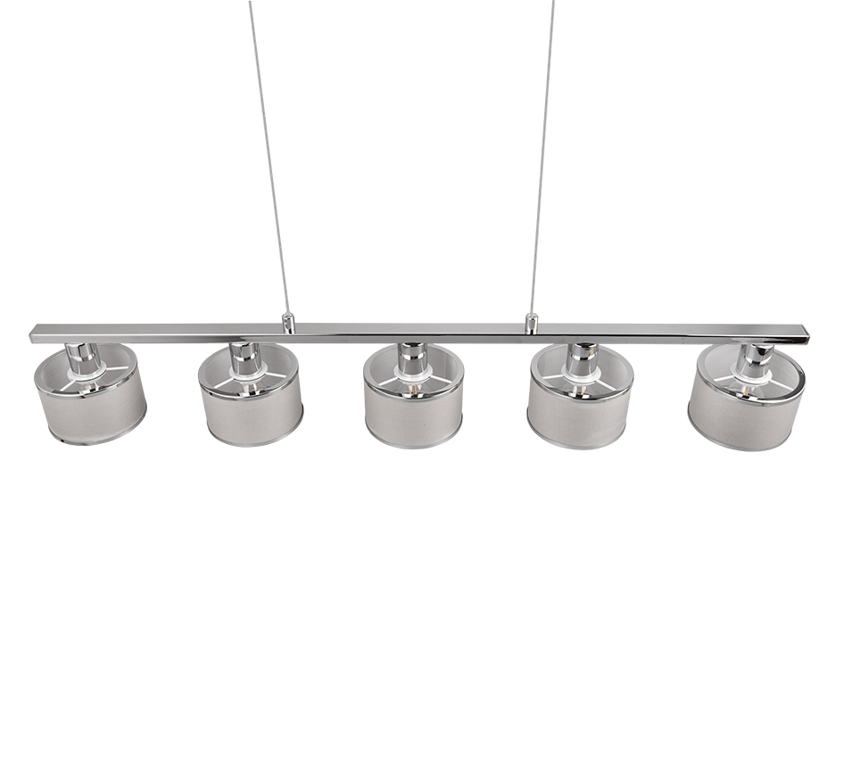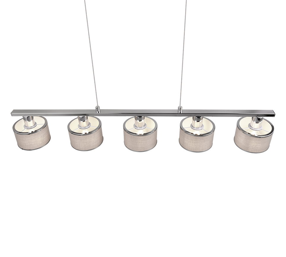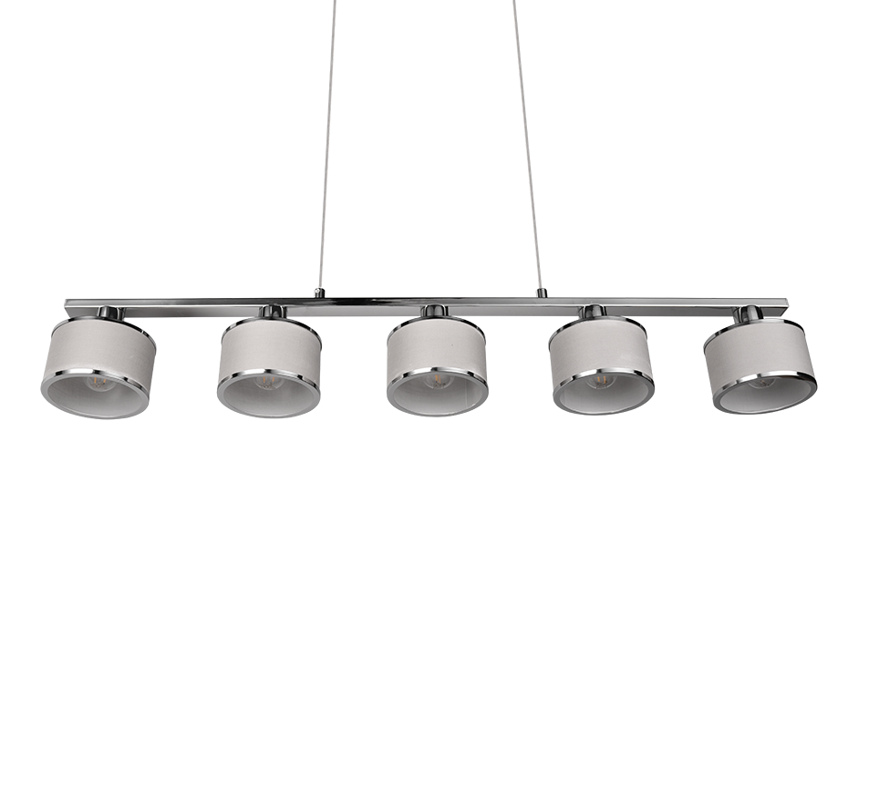 See viie valguspalliga rippvalgusti loob teie kodus sooja ja kutsuva atmosfääri, sobides ideaalselt nii elutuppa, söögituppa kui ka kontoriruumi. Kvaliteetsest tekstiilist varjud ja elegantne kroomitud viimistlus annavad ruumile stiilse ning kaasaegse ilme, samas kui silindrilised vormid tagavad valguse ühtlase ja meeldiva hajutamise. See valgusti pakub nii praktilist valgustust igapäevasteks tegevusteks kui ka hubasust, mis muudab iga õhtu mõnusaks ja rahulikuks.