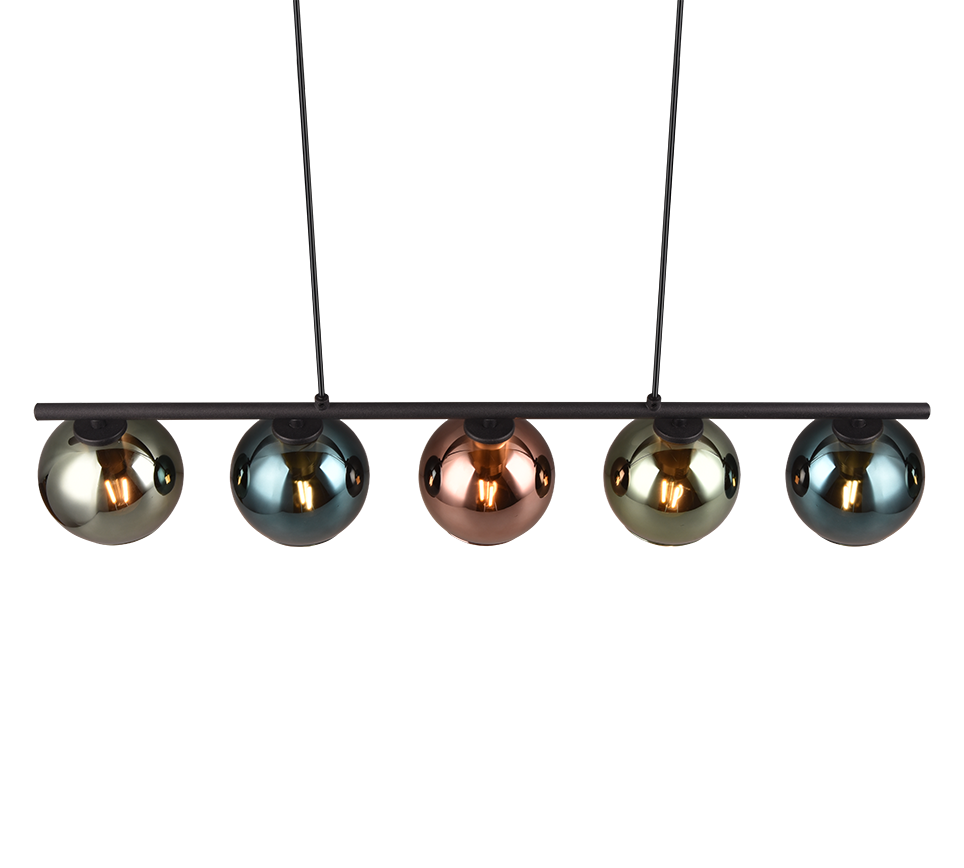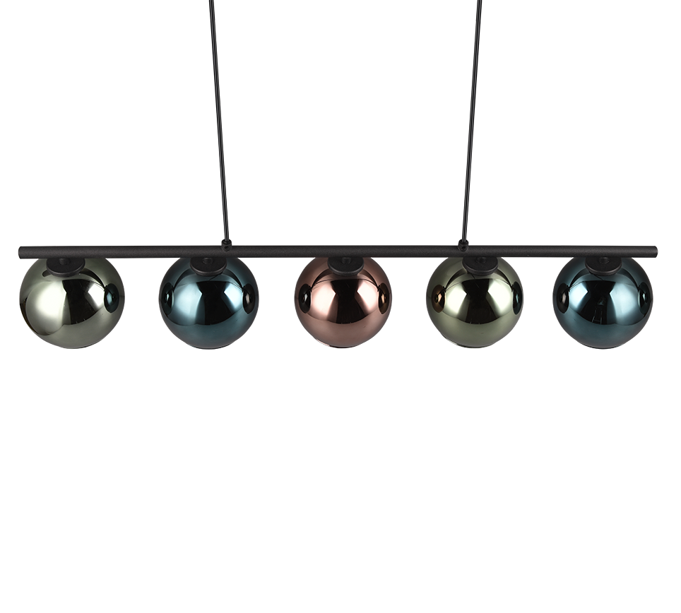 Viis värvilist klaasist valguspalli loovad ruumi maagilise valgusemängu ja lisavad teie söögitoale stiilse ning silmapaistva ilme. See elegantne riputusküünal sobib ideaalselt kodu hubaseks ja värvikirevaks valgustamiseks.