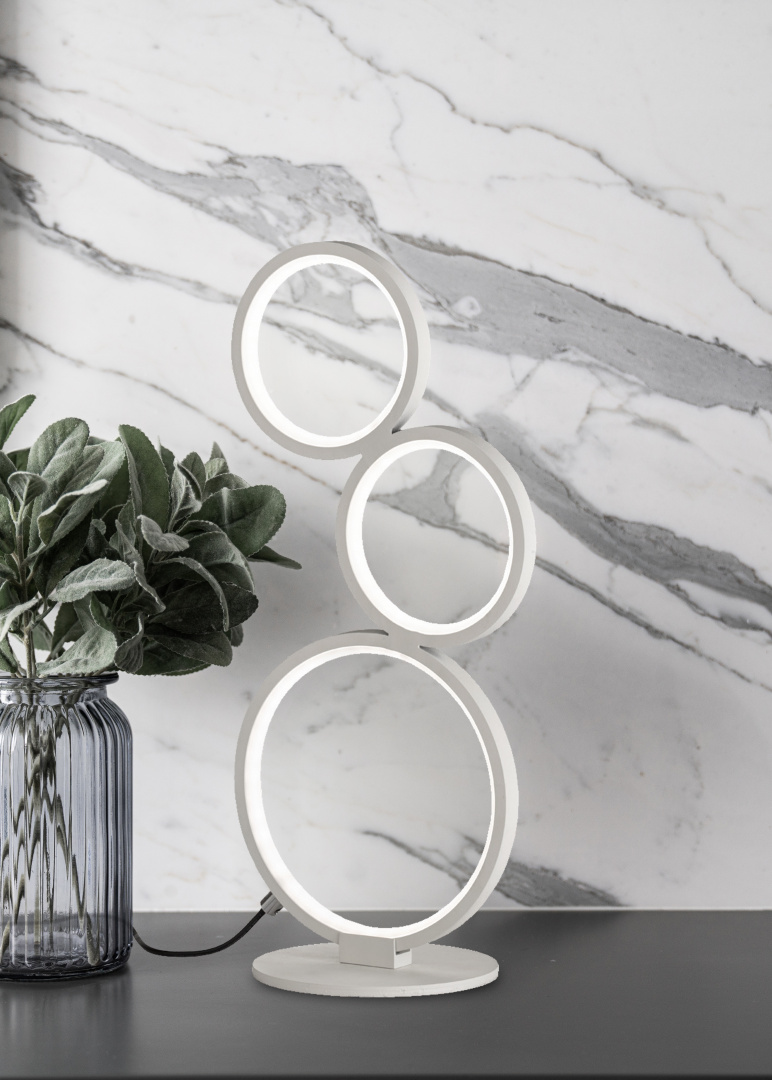 Kolme erineva suurusega rõngastest koosnev laualamp loob meeldiva valguse ja unikaalse disaini. Integreeritud dimmeriga saad hõlpsasti reguleerida LED-valgustuse intensiivsust vastavalt meeleolule.