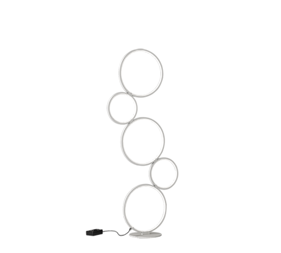 Viie erineva suurusega rõngaga põrandalamp loob hubase valguse ning integreeritud dimmer võimaldab hõlpsalt reguleerida LED-valgustite heledust vastavalt vajadusele. Mattvalge viimistlus sobib hästi igasse modernsesse interjööri.