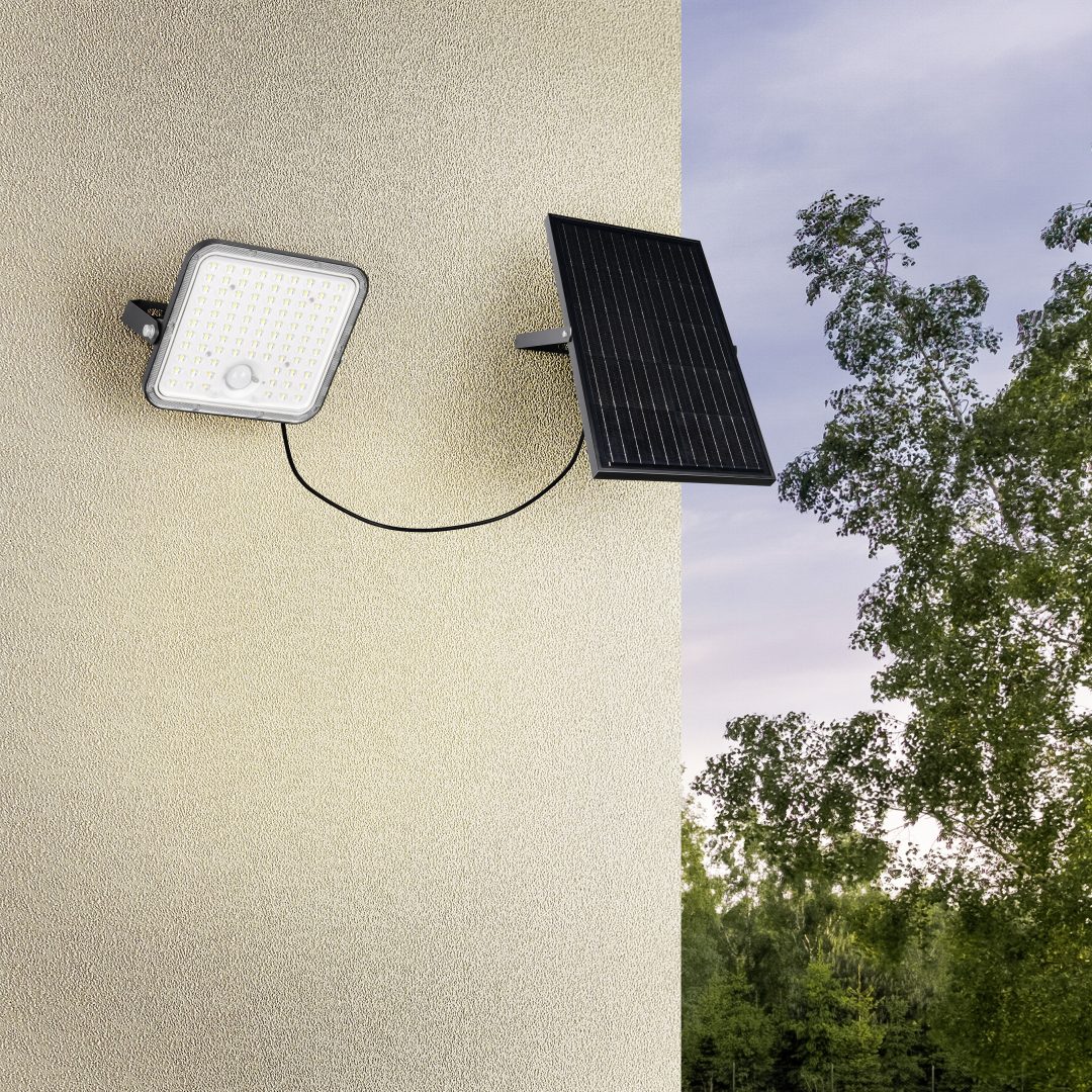 See matt musta viimistlusega päikeseenergial töötav LED-valgusti süttib liikumist tuvastades ning pakub meeldivat 4000K neutraalset valgust, sobides ideaalselt energiasäästlikuks välisvalgustuseks.