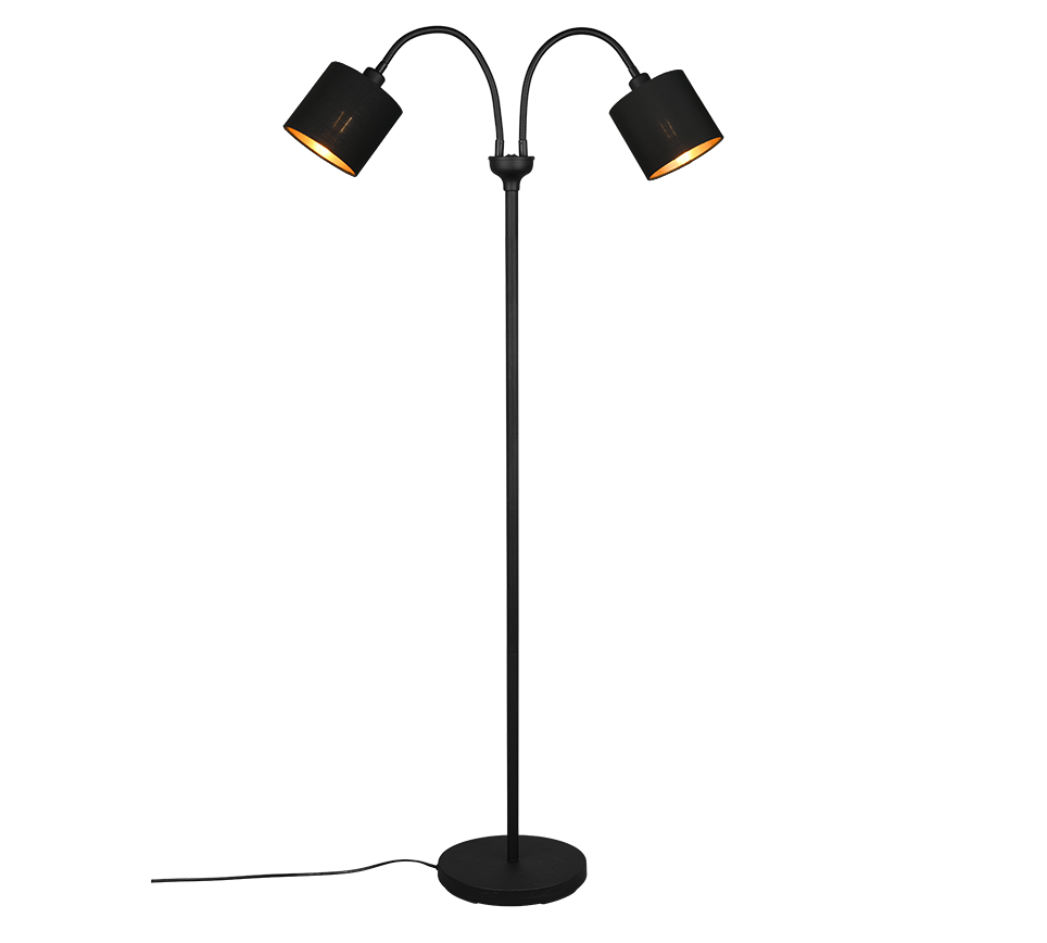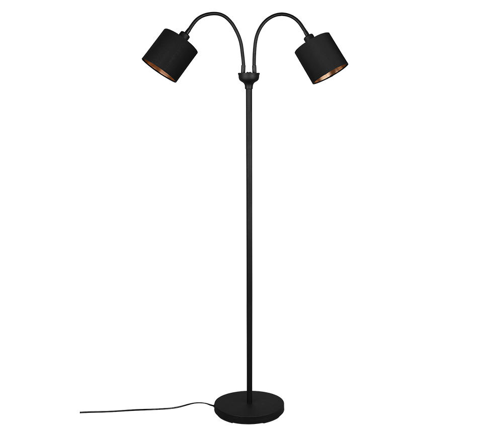 Kaheosaline põrandalamp pakub sooja ja hubast valgust tänu tekstiilist varjudele ning sobib oma lihtsa ja kaasaegse disainiga hästi erinevatesse interjööridesse. Mattmust ja kuldse viimistlusega lamp lisab ruumile stiili ning mugavust.
